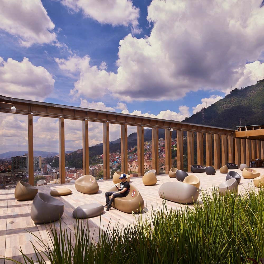Visible desde la avenida Caracas, este edificio tiene 70 metros de altura y 14 pisos —que albergan 1.200 metros cuadrados—, los cuales responden a la idea de crear un campus vertical. Para hacer realidad ese concepto, la universidad abrió un concurso privado ganado por el arquitecto Juan Pablo Ortiz y el estudio Taller 301, que unidos lograron proponer este proyecto arquitectónico y urbano.