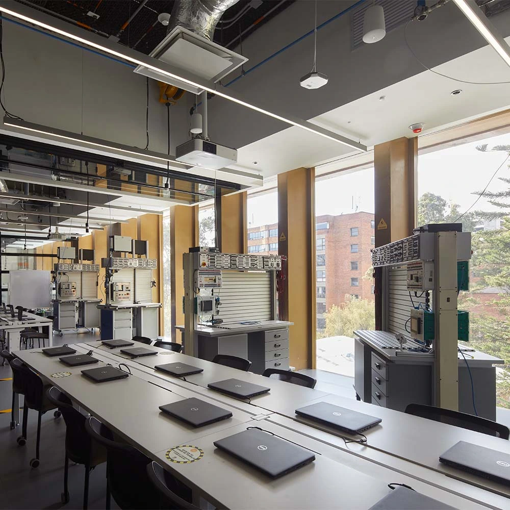El eclecticismo de estilos arquitectónicos que se puede encontrar en el campus de la Pontificia Universidad Javeriana en Bogotá define su identidad diversa y la multiplicidad de sus usos. Esa mezcla, que está contenida en la sede de la Facultad de Ingeniería, es un buen ejemplo para entenderla. En 2020 se inauguró el edificio de laboratorios, que se integró a una estructura de ladrillo ya existente, y que dialoga con el resto de su entorno de diferentes maneras.